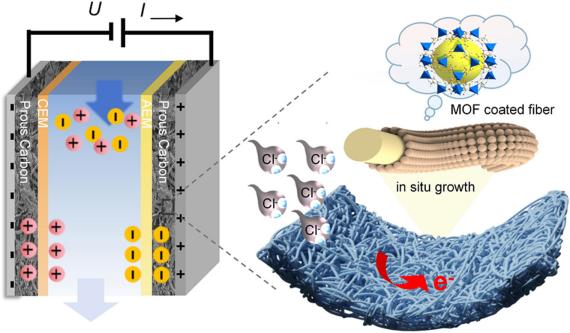 研究人员通过无粘结剂成型与表面官能团诱导,实现了金属有机框架(MOF)在菌丝纤维表面原位定向生长与复合,构建出一体化多孔碳CDI电极。该材料兼具高比表面积、高导电性、多级孔隙结构及优异的亲水性。在10 mmol·L⁻¹ NaCl溶液及1.2 V工作电压条件下,该电极展现出卓越的脱盐性能,其盐吸附容量高达40.8 mg·g⁻¹,平均吸附速率1.4 mg·g⁻¹·min⁻¹,显著优于目前多数文献报道的碳基电极材料。本研究不仅从结构设计上突破了传统电极中粘结剂使用导致阻抗升高、活性位点覆盖等问题,也为基于生物质与MOF协同构建高性能、可持续CDI电极提供了新思路与有效方法。