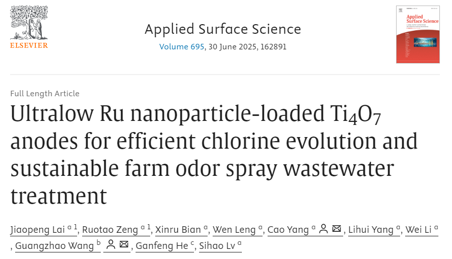 近日,我校生态环境工程技术研发中心吕斯濠教授团队的杨草副研究员在环境领域国际知名期刊《Applied Surface Science》上发表了题为“Ultralow Ru nanoparticle-loaded Ti4O7 anodes for efficient chlorine evolution and sustainable farm odor spray wastewater treatment”的研究论文。该成果以东莞理工学院为第一署名单位,生态环境工程技术研发中心硕士生赖侥鹏与生态环境与建筑工程学院本科生曾若涛为共同第一作者,生态环境工程技术研发中心杨草副研究员与长江师范学院王广钊教授为共同通讯作者,该研究得到国家自然科学基金和东莞理工学院拔尖青年博士科研启动资金的资助。