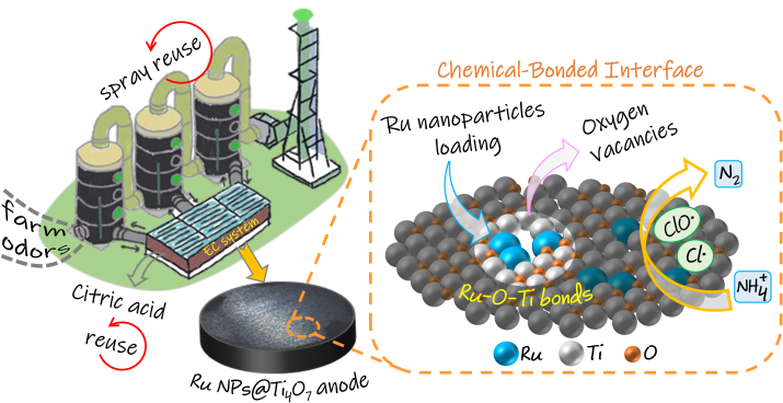 面向规模化养殖行业迫切的大体量臭气/异味喷淋废水减排与资源化需求,以及当前依赖高含量贵金属钌、铱的涂层阳极面临的析氧竞争与稳定性挑战,开发高效稳定的非贵金属氯氧化阳极材料,已成为推动电化学水处理技术升级与农业绿色发展的关键。本研究基于金属载体相互作用(MSI)的精准调控制备了具有Ru−O−Ti稳定成键结构的超低钌(0.3 wt%)负载的高活性Ti4O7电极,研究表明该电极展示出优异的析氯性能,具有较低的过电位(96.5 mV)、Tafel斜率(64.24 mV dec−1)以及较高的Cl2选择性(96.6%),尤其是其质量活性可达商业DSA电极的18倍,且表现出良好的电化学稳定性。同时,该体系实现了对模拟含氨废水以氯自由基(Cl·)为主导的高效降解处理,其中,动力学常数高达1.02 min−1,N2选择性高达82%,能耗约71.6 kWh kg−1 N。此外,研究对模拟含氨臭气喷淋废水的资源化利用进行了概念验证,能够实现废水净化回用以及柠檬酸吸收剂再生循环,通过降本增效真正实现养殖业的可持续发展。该项研究为规模化养殖场恶臭减排行业面临的巨大挑战提供了很好的解决方案。