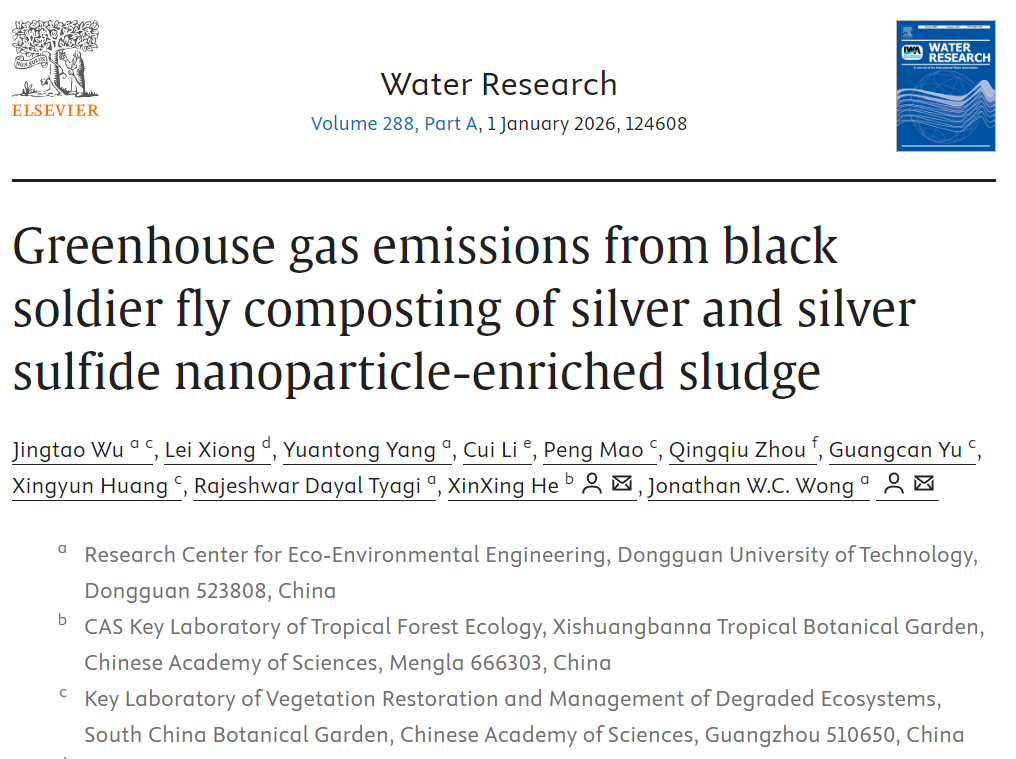1月,东莞理工学院生态环境工程技术研发中心(简称“生态中心”)科研团队在黑水虻协同污泥资源化处理与温室气体减排研究方面取得重要进展。该研究系统揭示了含银/硫化银纳米颗粒污泥在黑水虻堆肥过程中的温室气体排放规律及其微生物学机制,提出了利用银形态调控黑水虻堆肥过程、降低氧化亚氮和甲烷排放的新思路。相关成果以“Greenhouse gas emissions from black soldier fly composting of silver and silver sulfide nanoparticle-enriched sludge”为题发表于国际期刊Water Research。东莞理工学院为论文第一完成单位,生态中心吴靖滔副研究员为论文第一作者,中国科学院西双版纳热带植物园何新星副研究员和生态中心Jonathan W.C. Wong教授为论文共同通讯作者。