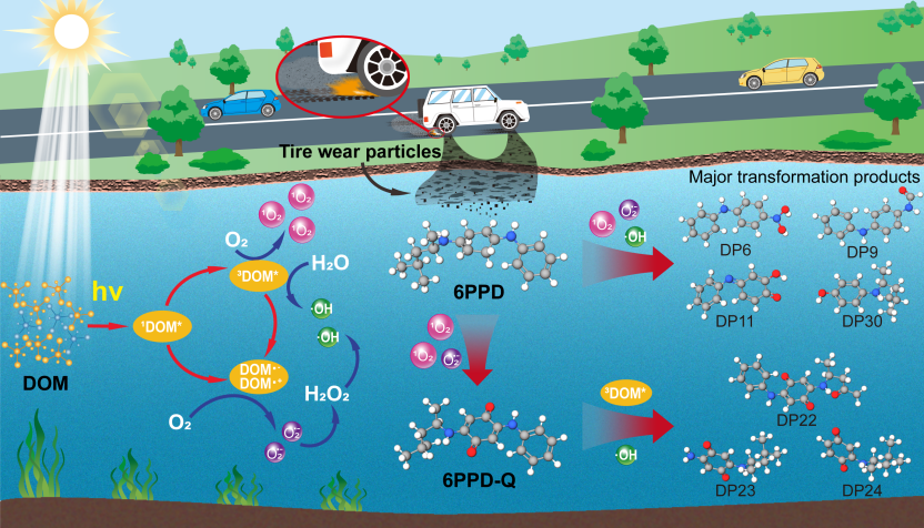 该研究聚焦轮胎橡胶抗氧化剂 6PPD 这一全球广泛分布的新污染物,针对其高毒衍生物 6PPD-醌(6PPD-Q)在水环境中的生成机制这一关键科学问题,系统探究了水环境中普遍存在的溶解性有机质(DOM)对太阳光驱动下 6PPD 向 6PPD-Q 转化的调控机制。