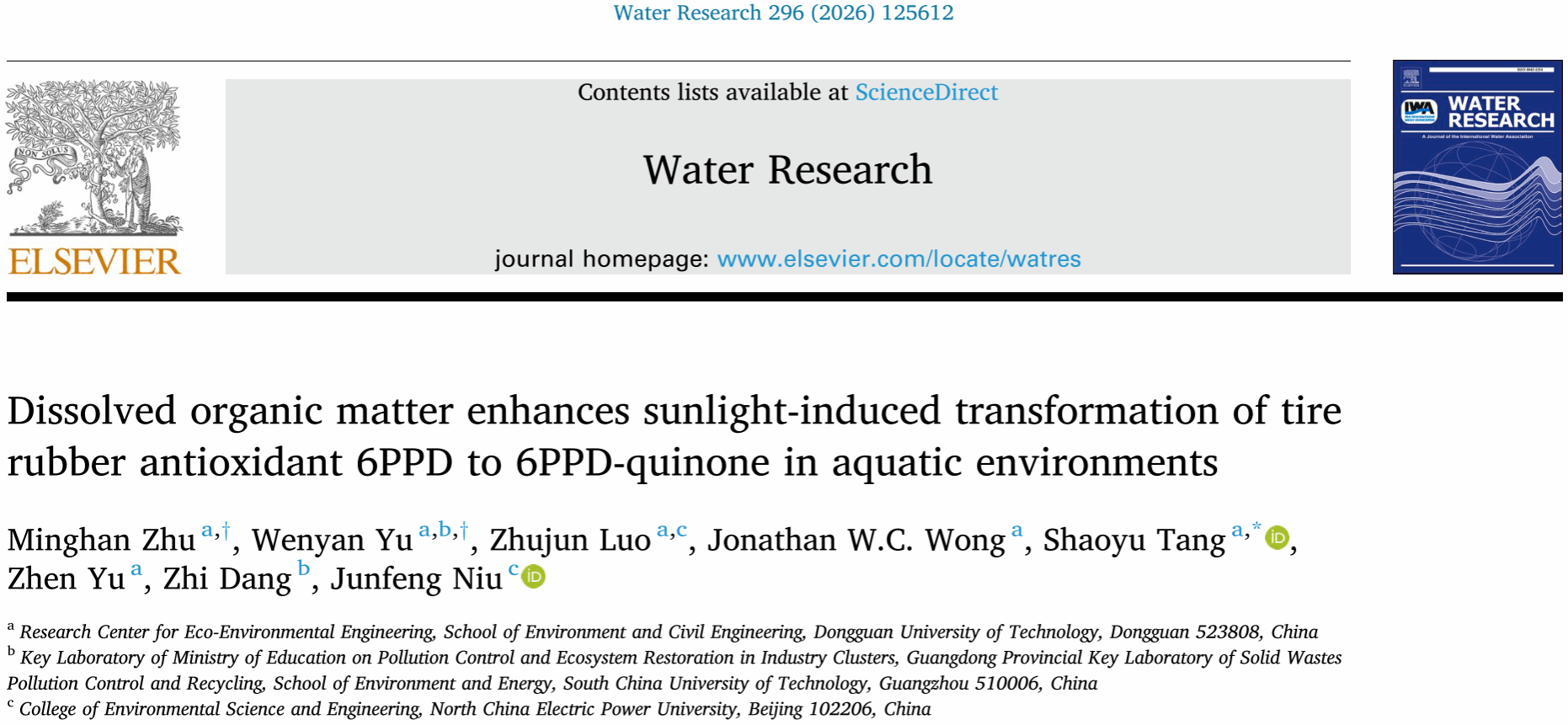 近日,我校生态环境工程技术研发中心唐少宇副研究员在环境领域国际权威期刊《Water Research》上发表题为 “Dissolved organic matter enhances sunlight-induced transformation of tire rubber antioxidant 6PPD to 6PPD-quinone in aquatic environments” 的研究论文,东莞理工学院为该论文第一署名单位,博士后祝铭韩与硕士研究生余雯燕为共同第一作者,唐少宇副研究员为通讯作者。