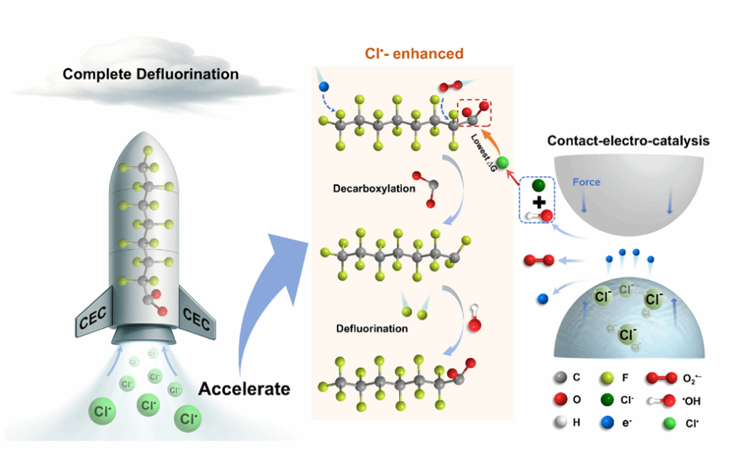 全氟和多氟烷基物质(PFAS)是一类具有极高环境持久性和生物累积性的合成有机氟化物,其碳-氟键(C‒F)解离能高达485 kJ·mol−1,难以被自然降解。传统高级氧化工艺(AOPs)主要依赖羟基自由基(•OH),但其氧化能力不足以直接断裂C‒F键,导致短链中间产物累积、脱氟不完全。高级还原工艺(ARPs)虽能利用水合电子(eaq−)还原脱氟,但实际应用中存在活性电子利用效率低、低氟中间体顽固等瓶颈。近年来,接触电致催化(CEC)作为一种新兴的绿色催化技术,通过液-液/固-界面的接触带电诱导电子转移,可同时产生氧化性活性氧(ROS)和还原性接触电子(e⁻),为PFAS的氧化-还原协同降解提供了新平台。然而,真实水体中普遍存在的氯离子(Cl⁻)在CEC体系中的角色尚不明确。Cl⁻能够捕获•OH生成活性氯物种(RCS),如氯自由基(Cl•)、二氯自由基阴离子(Cl2•−)和次氯酸根自由基(ClO•)。这些RCS对有机污染物具有潜在氧化能力,但其在PFAS降解中的具体作用机制、对脱氟效率的影响以及是否有毒副产物生成,均缺乏系统研究。