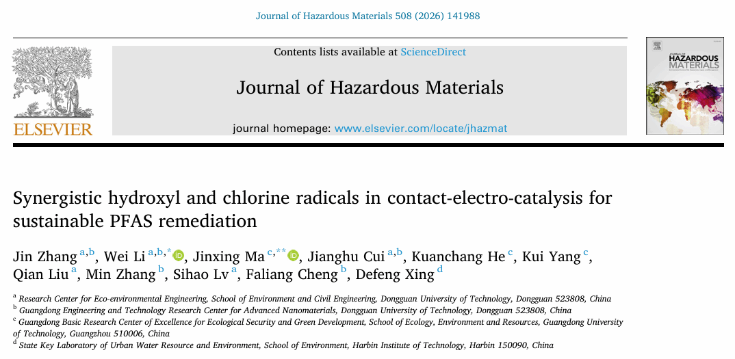 近日,生态中心李威特聘教授课题组联合广东工业大学马金星教授在环境领域TOP期刊 《Journal of Hazardous Materials》 上发表了题为“Synergistic hydroxyl and chlorine radicals in contact‑electro‑catalysis for sustainable PFAS remediation”的研究论文。该成果以东莞理工学院为第一署名单位,生态中心在读硕士研究生张金为第一作者,李威特聘教授与广东工业大学马金星教授为共同通讯作者。研究得到国家自然科学基金、国家重点研发计划、广东省基础与应用基础研究基金、广东省高校重点科研平台和项目的资助。