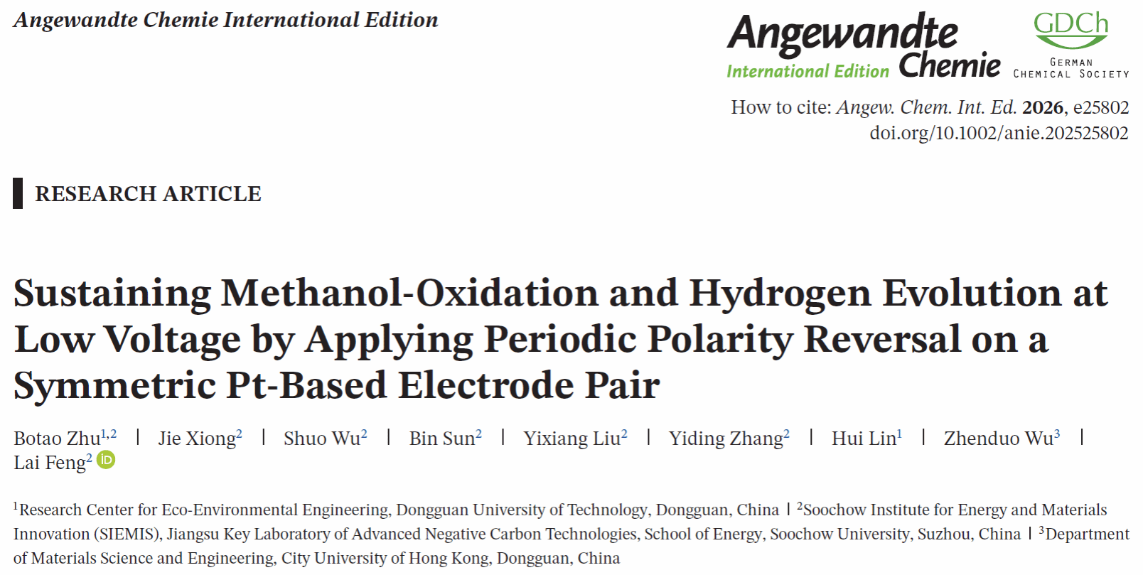近日,生态中心林辉教授团队与苏州大学冯莱教授、香港城市大学(东莞)吴桢舵教授合作在国际TOP期刊《Angewandte Chemie International Edition》(IF=17)发表了题为“Sustaining Methanol-Oxidation and Hydrogen Evolution at Low Voltage by Applying Periodic Polarity Reversal on a Symmetric Pt-Based Electrode Pair”的研究论文。该成果以东莞理工学院为第一署名单位,生态中心博士后朱博韬为唯一第一作者。