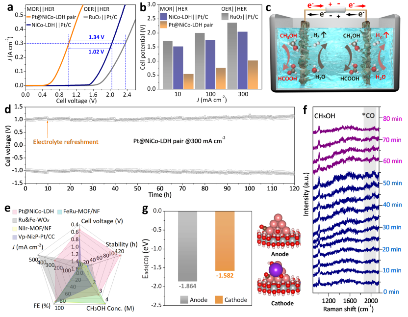 本论文提出了一种结合催化剂设计与电解策略优化的综合解决方案。首先通过将Pt纳米颗粒锚定在NiM-LDH(M=Co, Mn, Cu, Fe)载体上,构建了一系列Pt@NiM-LDH催化剂。并利用对称电极对(Pt@NiCo-LDH||Pt@NiCo-LDH)结合周期性电流极性反转策略,有效减缓了MOR||HER耦合电解过程中Pt基催化剂的中毒现象。研究结果显示电流极性反转诱导电极表面双电层重构,从而有利于CO脱附,可实现催化活性位点再生。该系统在1.02 V的超低电压下实现了300 mA cm-2的工业级电流密度,并稳定运行超过120小时,甲酸与氢气的联合法拉第效率接近200%。